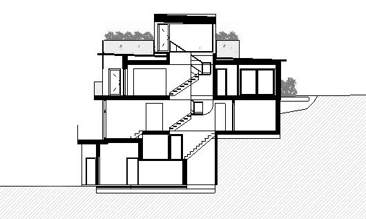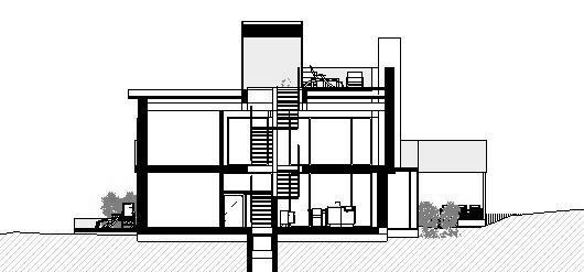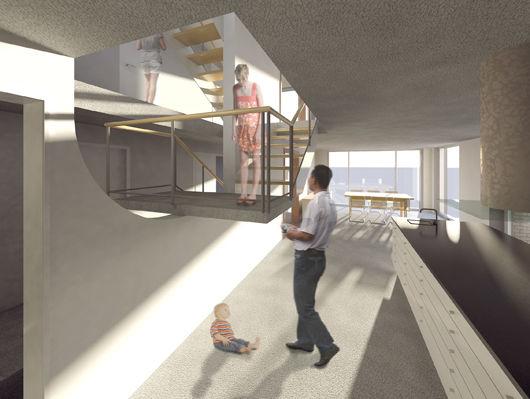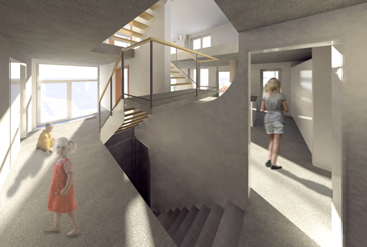 Den tidigare slutna planlösningen har öppnats upp med hjälp av ett centralt trapphus, som ökar den visuella kontakten mellan rummen och mellan våningsplanen. Trappan avslutas med en lanterninbyggnad på taket, som släpper ner dagsljus till de invändiga rummen.