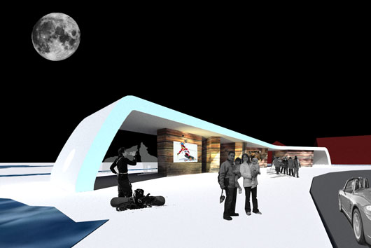 Syskonbyggnaderna för resecentrum och rastplats består av en varsin skiva som växer upp ur marken – vintertid en stiliserad snödriva, under barmarkssäsongen mossbelupen backe. Skivan bildar tak över knuttrimrade volymer med infoskyltar, digitala displayer, WC och annan service. De arkitektoniska komponenterna är snö, mossa, digital information knuttimrad hälsingefur och rovdjur.