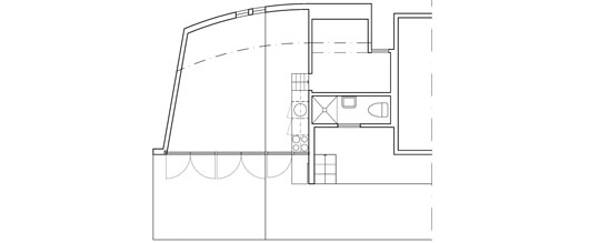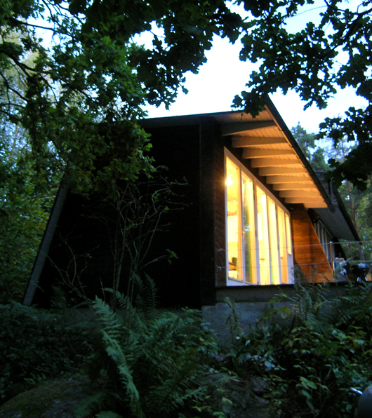 Fritidshuset står på en bergsformation, som stupar 4 meter tvärt mot norr. Med samma vinkel och i samma plan som stupet, lutar husets norrfasad. Norrfasaden böjer sig också konvext med samma radie, som berget den står på.