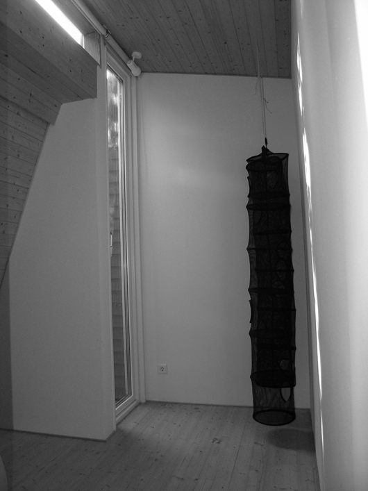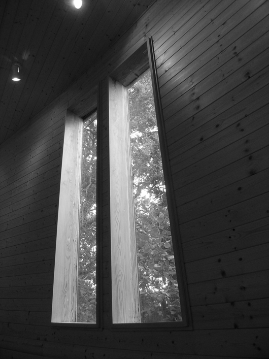 Huset har en släthyvlad träpanel bestruken med kimrökspigmenterad tjära, som doftar gott och släpper igenom träets ådringsmönster. Huset öppnar sig med generösa glaspartier med utsikt mot havet och seglare längs Furusundsleden i Stockholms skärgård. Huset öppnar sig också med takfönster med utsikt över en 100-årig ek och sommarhimlens stjärnkonstellationer.