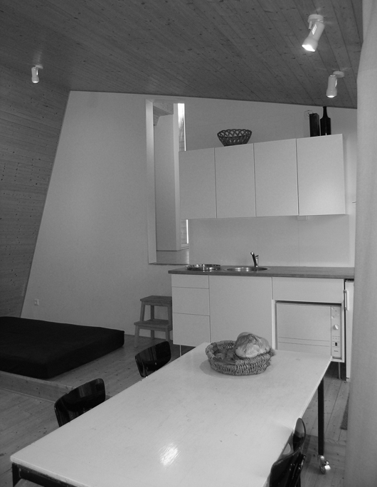 Byggnaden är optimerad för drift utan värmesystem: från sommar till höst värms huset av solenergi via glaspartierna i söderfasaden; mot norr är byggnaden relativt sluten. Naturmaterial har genomgående använts i byggnaden. Stommen är byggd med virke från tomten.